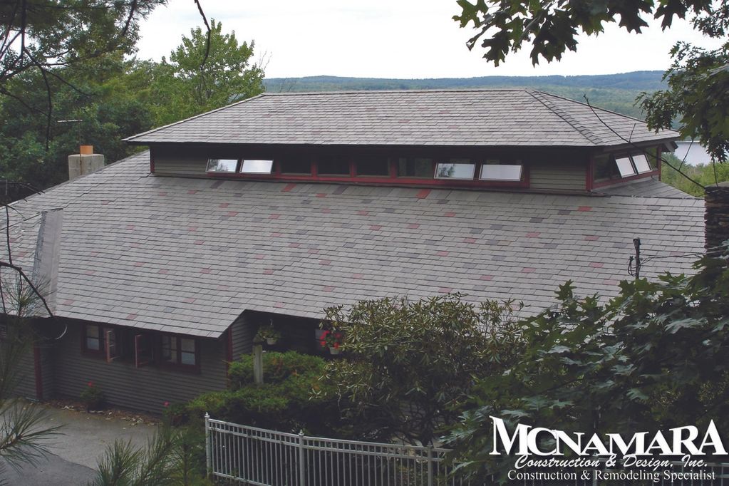 Perched atop a hillside in Central Massachusetts, this custom home renovation showcases expert craftsmanship and attention to architectural detail. The redesigned roof features premium-grade shingles and a unique clerestory window system that floods the interior with natural light while maintaining energy efficiency and weather protection.
